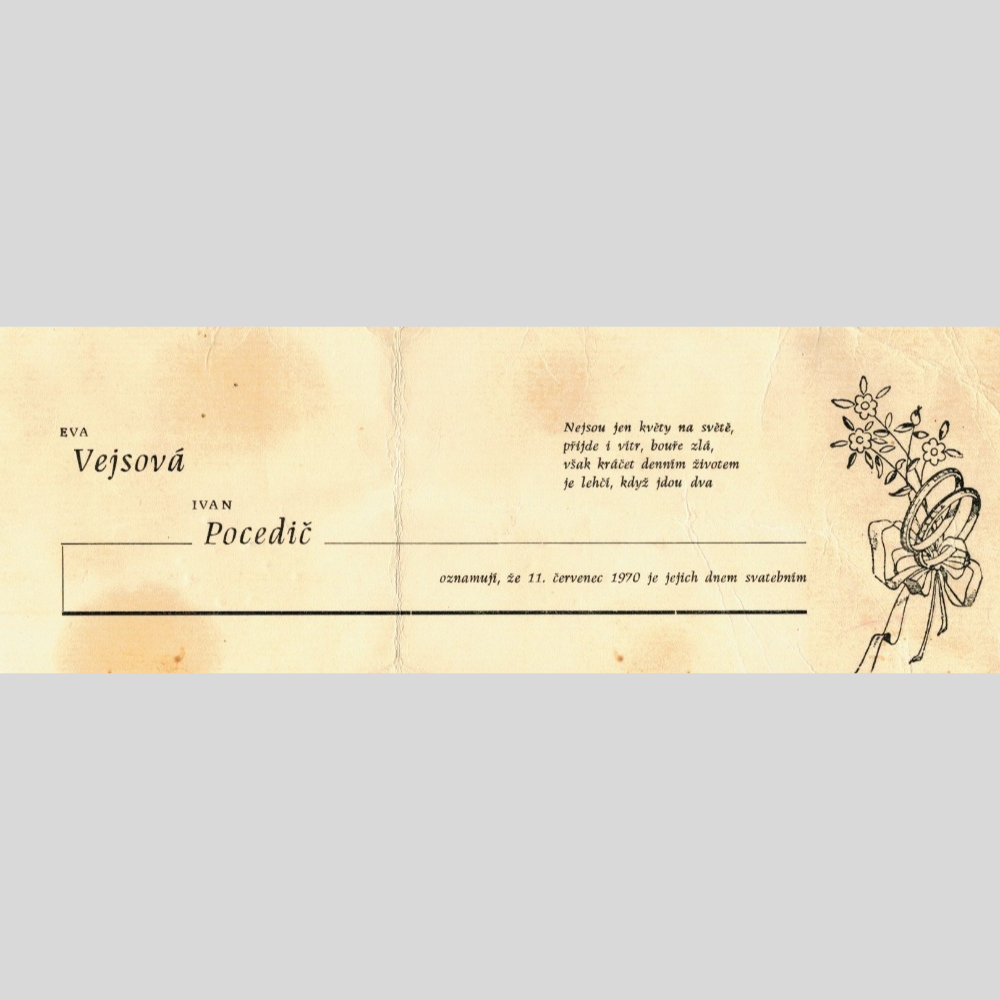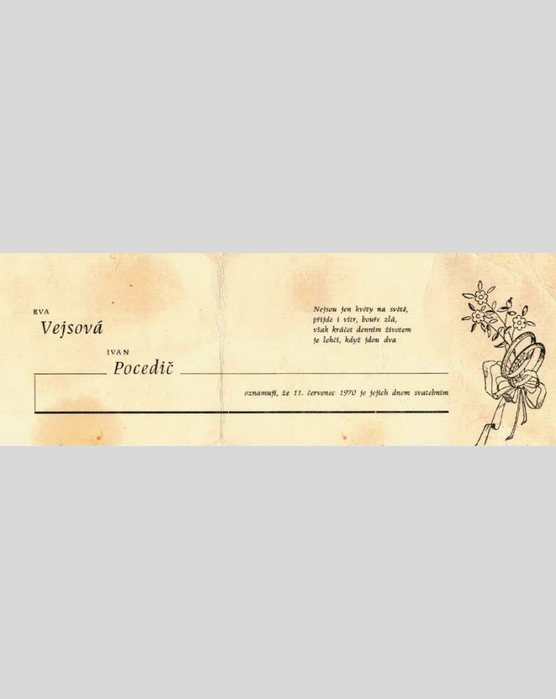 Eva Pocedičová, née Vejsová, was born on August 31, 1948 in Zlaté Hory. She was the second child of Jiří and Žofie Vejsová and grew up among three brothers. She spent her childhood in the picturesque surroundings of Zlaté Hory, where she attended elementary school. After graduating, she trained as a milliner at the Tonak company in Nový Jičín. It was there that she met her future husband, Ivan Pocedič.